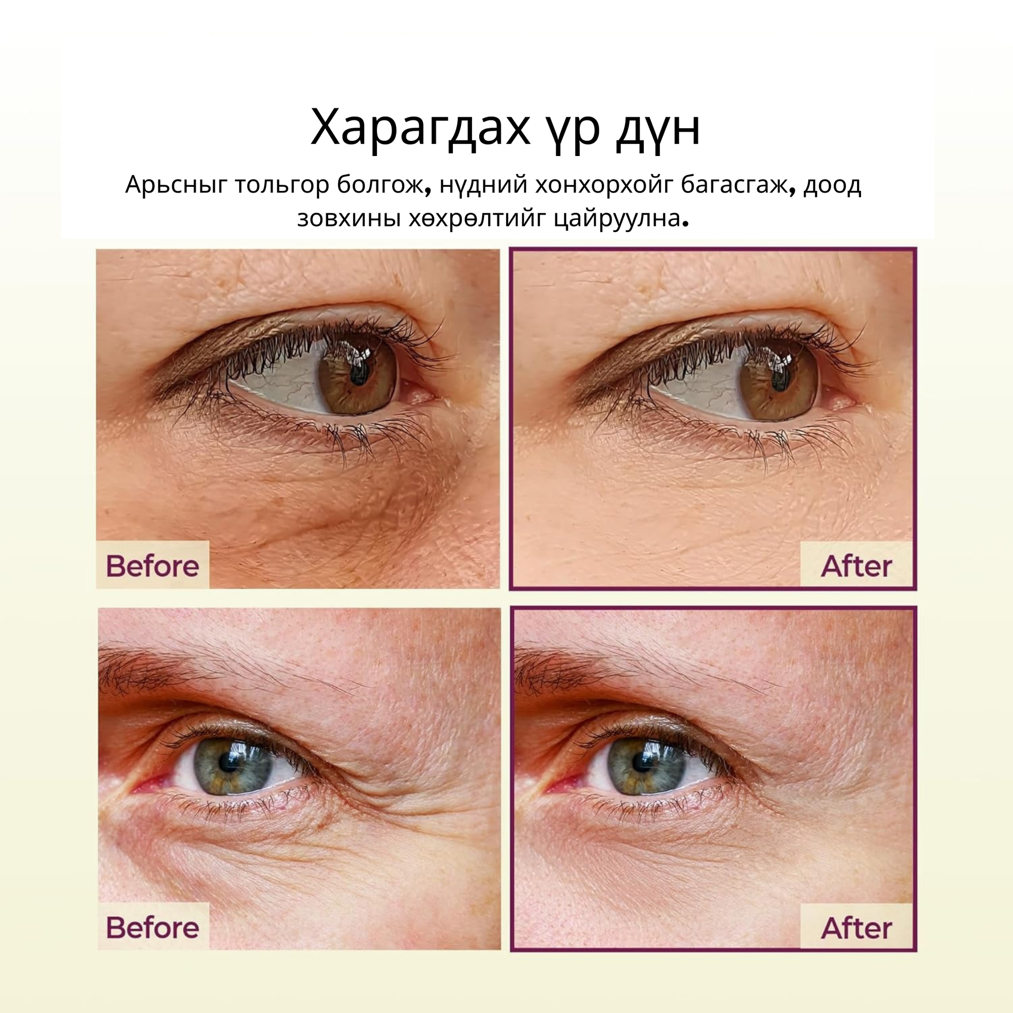 Нүүрээ цэвэрлэсний дараа хөнгөхөн өнхөрүүлж, эсвэл хурууныхаа өндөгөөр шаардлагатай хэсэгтээ товшиж хэрэглэнэ.